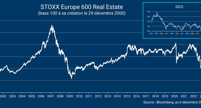 La baisse rapide des taux observée depuis la fin du mois d’octobre a particulièrement profité au secteur des foncières cotées au cours des dernières semaines. Ainsi, sur les marchés actions, le STOXX Europe 600 Real ,Estate (SX86P) a rebondi d’environ 25% depuis le 26 octobre, jour où l’indice avait atteint son plus bas niveau depuis décembre 2011.
