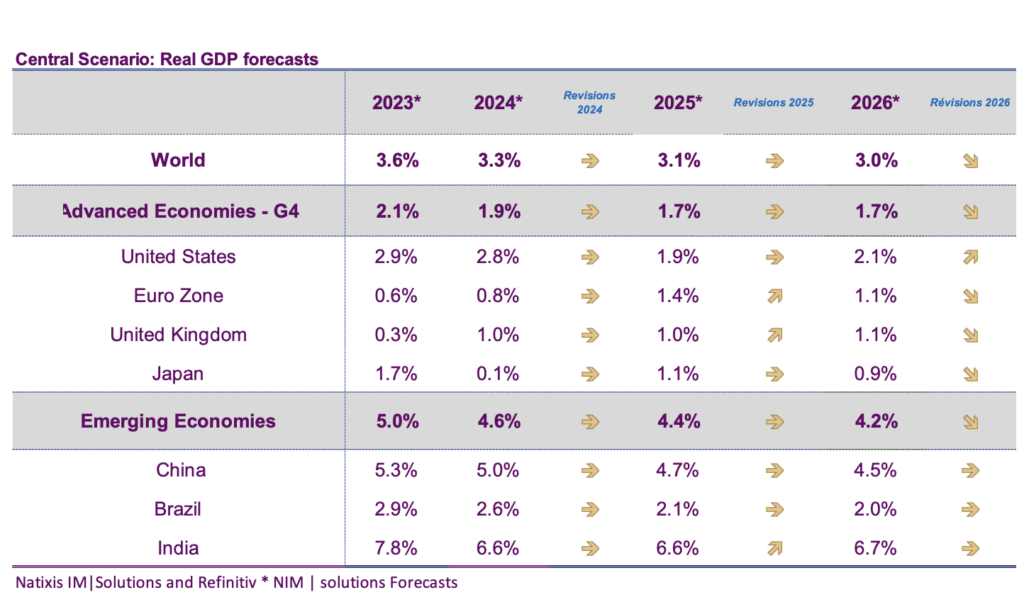 Aux Etats-Unis, après plus de 40 jours de paralysie administrative, la fin du shutdown marque un retour très progressif à la normale en matière de publication statistiques. Les données publiées pour septembre, notamment sur le front de l’emploi corroborent d’un cycle économique qui est resté en expansion au cours du troisième trimestre (les chiffres du PIB n’étant toujours disponibles). Les créations d’emplois se sont redressées en septembre et le taux de chômage s’établit à 4,4% de la population active. Les données d’enquêtes tant du côté des services que dans le secteur manufacturier n’indiquent qu’un très léger tassement de l’activité pour ce quatrième trimestre. La progression de l’activité devrait être en toute logique un peu plus modeste au quatrième trimestre avant de se redresser au premier trimestre 2026. Nous avons par conséquent révisé notre projection de croissance pour 2025 à 1.9% (contre 1,8%) et réhaussé nos attentes pour 2026 à 2,1% (contre 2,0%) soit des rythme de de croissance supérieurs aux anticipations du consensus.