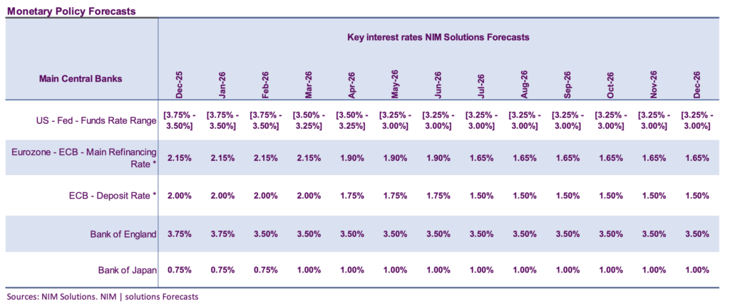 En Europe, le statu quo restera de mise en décembre et le marché ne semble pas anticiper de changements marqués pour la première partie de 2026. La trajectoire de croissance combinée à une inflation que nous attendons en repli pour 2026 ouvriraient la voix pour une voire deux baisse de taux en zone euro. La politique monétaire de la zone euro passerait dès lors en territoire accommodant.