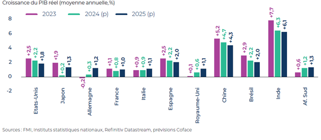 Malgré ce calendrier décalé, de nombreuses régions vont connaître une dynamique positive. Les pays d’Asie du Sud-Est atteindront, pour certains, des taux de croissance supérieurs à 6 % (Vietnam et Philippines). L’Inde, malgré un léger ralentissement, devrait enregistrer une croissance de 6,1 %. L’Afrique devrait également surperformer et dépasser les 4 % de croissance avec une accélération dans toutes les principales économies (Nigéria, Egypte, Algérie, Ethiopie, Maroc et, dans une moindre mesure, Afrique du Sud).